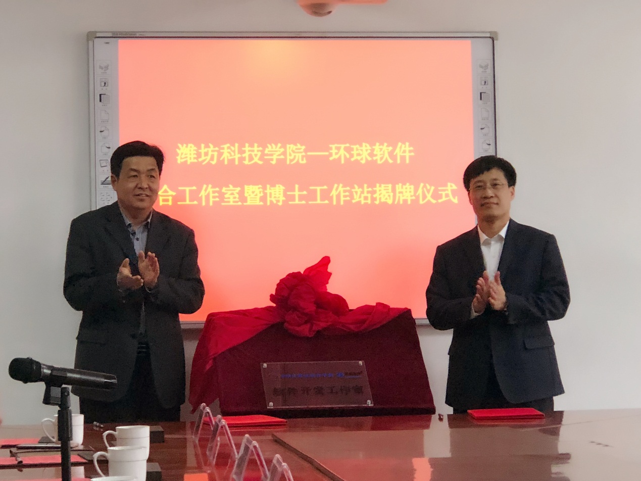 濰坊科技學院副校長李廣偉與環(huán)球軟件董事長劉德永為“濰坊科技學院-環(huán)球軟件聯(lián)合工作室”揭牌